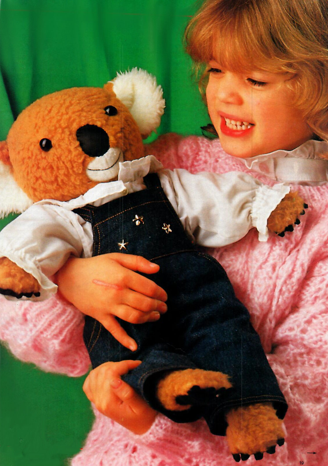 Mesures: 43 cm de haut. Fournitures: 0,40 m de fausse fourrure brune en 140 cm de large, 0,35 m de toile de coton serrée noire en 140 cm de large (ce tissu sert à faire l'ours intérieur et ne sera visible que sous les extrémités des pattes), des restes de fausse fourrure et de feutrine blanche, une chute de satin noir, 2 yeux noirs (ou boutons ronds) de 12 mm de diamètre et un sac de ouatine synthétique. Réalisation: confectionnez d'abord entièrement l'ours dans la toile de coton. Vous assemblerez ensuite l'enveloppe en fausse fourrure, dans laquelle vous glisserez l'ours noir. Pour fixer l'enveloppe, il faut la coudre à la main le long des ouvertures. Coupe: la toile de coton: décalquez et découpez les pièces du patron. Epinglez-les sur le tissu et taillez-les (sauf la truffe, le museau et les oreilles) en prévoyant 1 cm de couture. L'imitation fourrure: épinglez les pièces du patron sur l'envers du tissu, la flèche dans le sens du poil, et taillez-les en prévoyant 1 cm de couture. Coupez les mêmes morceaux que précédemment, sauf ceux des semelles (dessous des pattes postérieures). Coupez aussi le dos des oreilles dans l'imitation fourrure brune, l'intérieur est coupé dans la blanche. Coupez la truffe dans le satin en prévoyant 0,75 cm de couture, puis le museau dans la feutrine (avec une couture au milieu ou sans couture). Couture: la toile de coton: cousez les semelles sur la couture horizontale des pattes postérieures end. contre end. Pliez les pattes en longueur end. contre end. et cousez-les en piquant les côtés des «pieds» et tout le tour des griffes: piquez à petits points et faites un point entre chaque griffe pour pouvoir cranter la couture ultérieurement. Fermez le côté des pattes et ménagez l'ouverture du haut. Crantez et réduisez la couture entre chaque griffe; retournez les pattes sur l'endroit et ressortez bien les griffes avec un crayon ou tout autre objet pointu. Piquez le côté et le bas des pattes antérieures, retournez-les sur l'endroit de la même manière. Bourrez bien les 4 pattes de ouatine synthétique, tout en leur laissant une certaine souplesse. Piquez les coutures des côtés et du milieu du corps, retournez-le sur l'endroit et bourrez-le de ouatine, en la tassant bien. Cousez les 4 pattes sur le corps à la main, à petits points solides, et rajoutez éventuellement un peu de ouatine pour que les contours de l'ours soient bien ronds. Piquez les morceaux des côtés de la tête sur ceux du dos (repère 0 à M), puis sur celui du devant (repère 0 à P). Piquez le milieu dos (repère Q à K). Fermez enfin la petite couture devant (menton) en partant de P, puis celle du dessus (repère O à I à 0). Retournez la tête sur l'endroit, bourrez-la en tassant très fortement la ouatine, et cousez-la sur le corps à la main. L'enveloppe en imitation fourrure: assemblez tous les morceaux à 2 mm des repères (prévoyez des coutures de 8 mm). Piquez les côtés des quatre pattes. Assemblez les morceaux du corps en arrêtant la couture milieu dos au repère de la fente. Superposez les morceaux des oreilles (brun sur blanc), piquez, retournez-les sur l'endroit, pliezles et bâtissez-les à leur place sur les morceaux dos de la tête (voir les repères). Assemblez les morceaux de la tête (voir l'explication de l'ours en coton) en ménageant l'ouverture dos; retournez la tête sur l'endroit. Piquez le milieu du museau et cousez-le sur la tête en faisant des petits points à la main, brodez en noir la ligne de séparation du museau. Cousez ensuite la truffe en la bourrant d'un peu de ouatine pour l'arrondir un peu. Cousez les 4 pattes et la tête sur le corps end. contre end. Retournez l'enveloppe sur l'endroit, glissez-y l'ours et fermez la fente dos à petits points. Faites un rentré en bas des pattes et cousez-les à points serrés sur l'ours en coton. Cousez les yeux à leur place. LA SALOPETTE Fournitures: 0,25 m de denirn (coton pour jean) en 100 cm de large, 3 rivets ou perles en forme d'étoile, 2 grosses pressions et un reste de doublure. Coupe: décalquez et découpez les pièces du patron. Epinglezles sur le tissu et taillez-les en prévoyant 1 cm de couture. Dans la doublure, coupez les fonds de poche et la doublure de l'empiècement/bretelles. Couture: piquez les fonds de poche sur les ouvertures devant, retournez-les et surpiquez l'ouverture. Glissez les côtés/fond de poche sous les devants et piquez le tour des fonds de poche. Fermez les coutures côté et intérieures des jambes; piquez l'entrejambe. Ourlez les jambes. Piquez la couture milieu dos de l'empiècement, puis celle de sa doublure . Superposez l’empiècement et sa doublure end. contre end., piquez le tour. Crantez angles et couture, retournez l'empiècement sur l'endroit et surpiquez le bord. Piquez l' empiècement sur la taille, surpiquez la couture. Posez les rivets sur la bavette, cousez les pressions sous les angles de la bavette et au bout des bretelles. LA CHEMISE Fournitures: 0,30 m de 80 cm de large, 4 petits boutons et 4 petites pressions, 1 m. de dentelle fine, un reste de ruban et d'élastique fin. Coupe: décalquez et découpez les pièces du patron. Epinglez les sur le tissu et taillez-les en prévoyant 1 cm de couture Coupez une bande de 50 X 3.5 cm pour le col volanté. Couture: à partir des marques indiquant les nervures, marquez 3 repères distants d'l cm les uns des autres en allant côtés; piquez 4 fines nervures sur ces marques. Bordez le col et le bas des manches de dentelle. Froncez le col et piquez-le sur l'encolure, l'env. du col contre l'endroit de la chemise, ses bords correspondant au milieu devant Couchez cette couture sous l’encolure et piquez-la avec un point zig-zag. Froncez les têtes de manches et cousez-les dans les emmanchures. Fermez les côtés et les manches. Piquez le ruban à plat sur l'envers des manches pour former une coulisse; glissez-y l'élastique et fermez-le par un point solide. Piquez un double ourlet