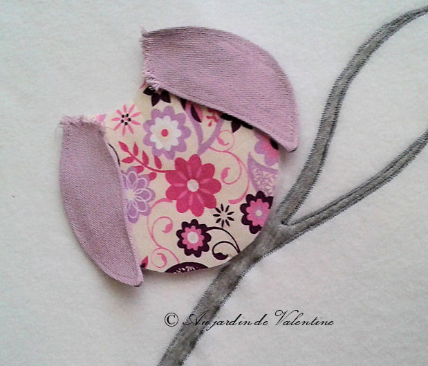 * Commencer par assembler un morceau de polaire, (sachant que le polaire est en double épaisseur pour plus de chaleur) avec l'imprimé * Sur l'autre polaire blanc, seront fixés les motifs ( vous pouvez choisir une couleur de polaire différente pour le verso; dans mon cas, j'ai fait en fonction de mes placards...). Il est sans doute plus pratique de fixer au fer et surjeter sur un coton, plutôt que sur du tissu polaire...A vous de voir ! * A partir de là, fixer les branches et faire un surjet serré sur les bords. * L'étape suivante est réservée à la chouette en commençant par préparer la tête , la mettre de côté