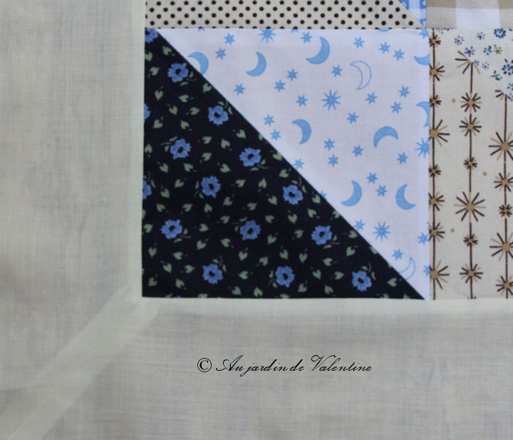* Coudre ces triangles deux par deux par l'hypoténuse (Pour vous en souvenir, l'idéal est de prendre une photo). * Puis assembler les carrés obtenus en fonction de l'agencement souhaité , un côté après l'autre * Assembler maintenant une de triangles obtenue à un côté du motif central , et ainsi de suite pour les 4 côtés