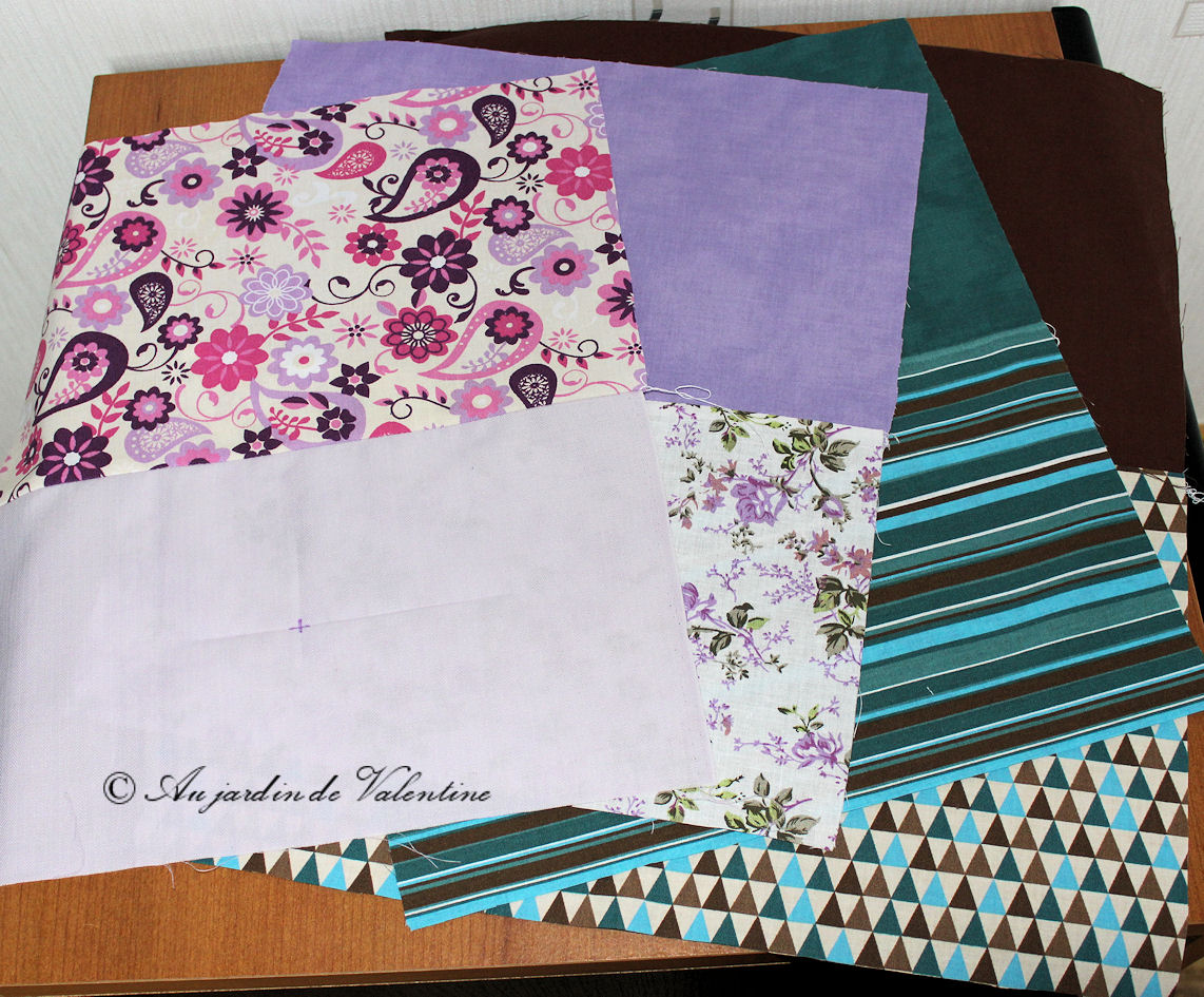 * Assembler 2 morceaux sur un côté * Poser le galon sur la ligne de séparation des 2 tissus différents de chacun des pochons