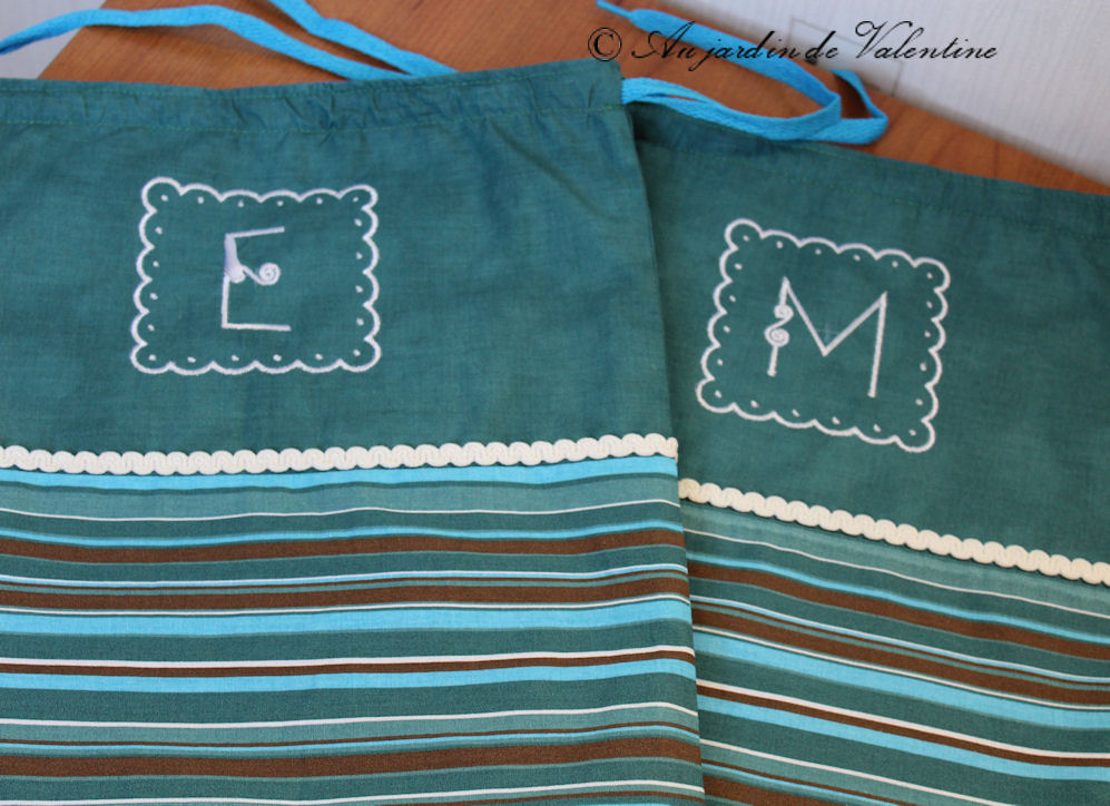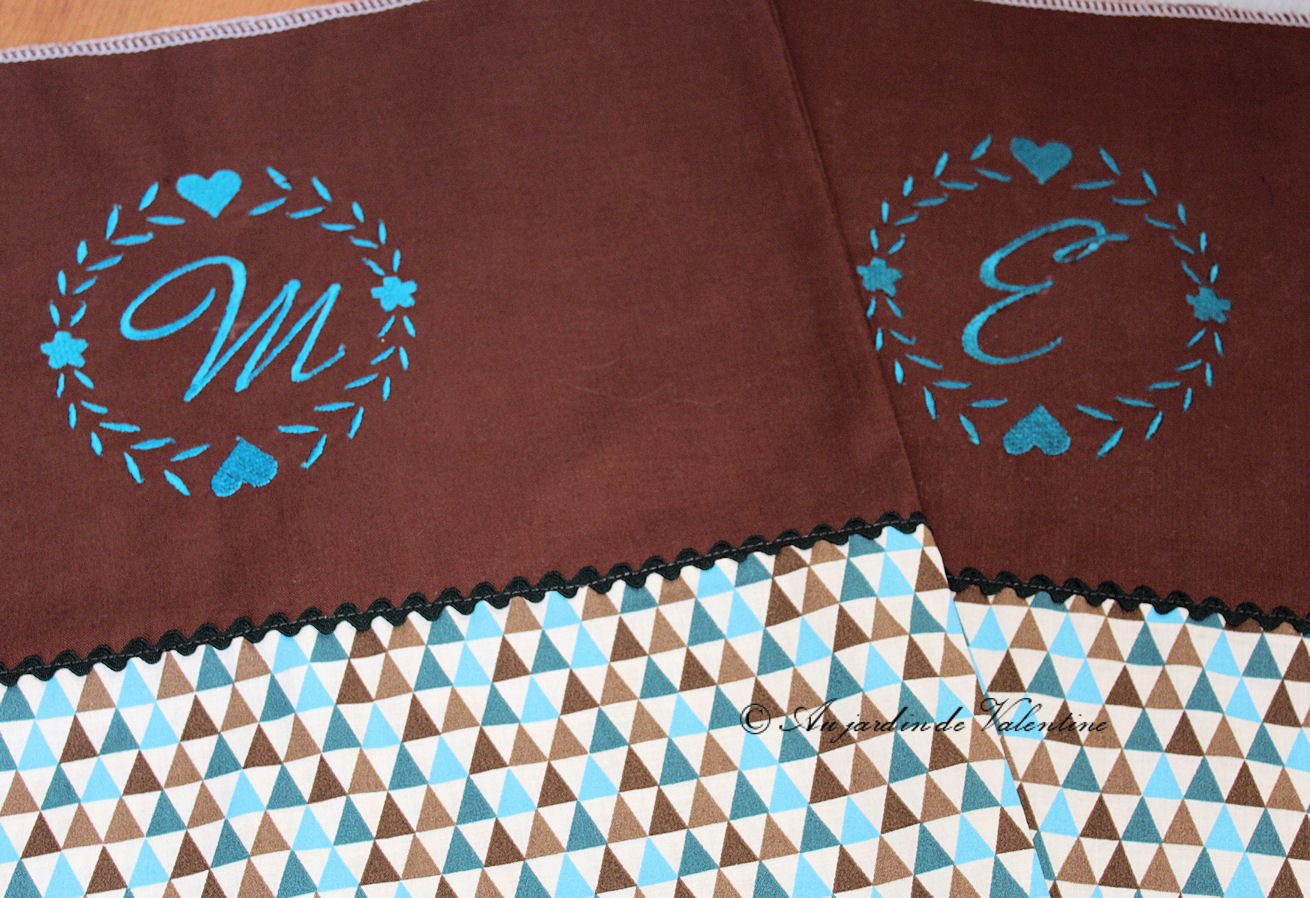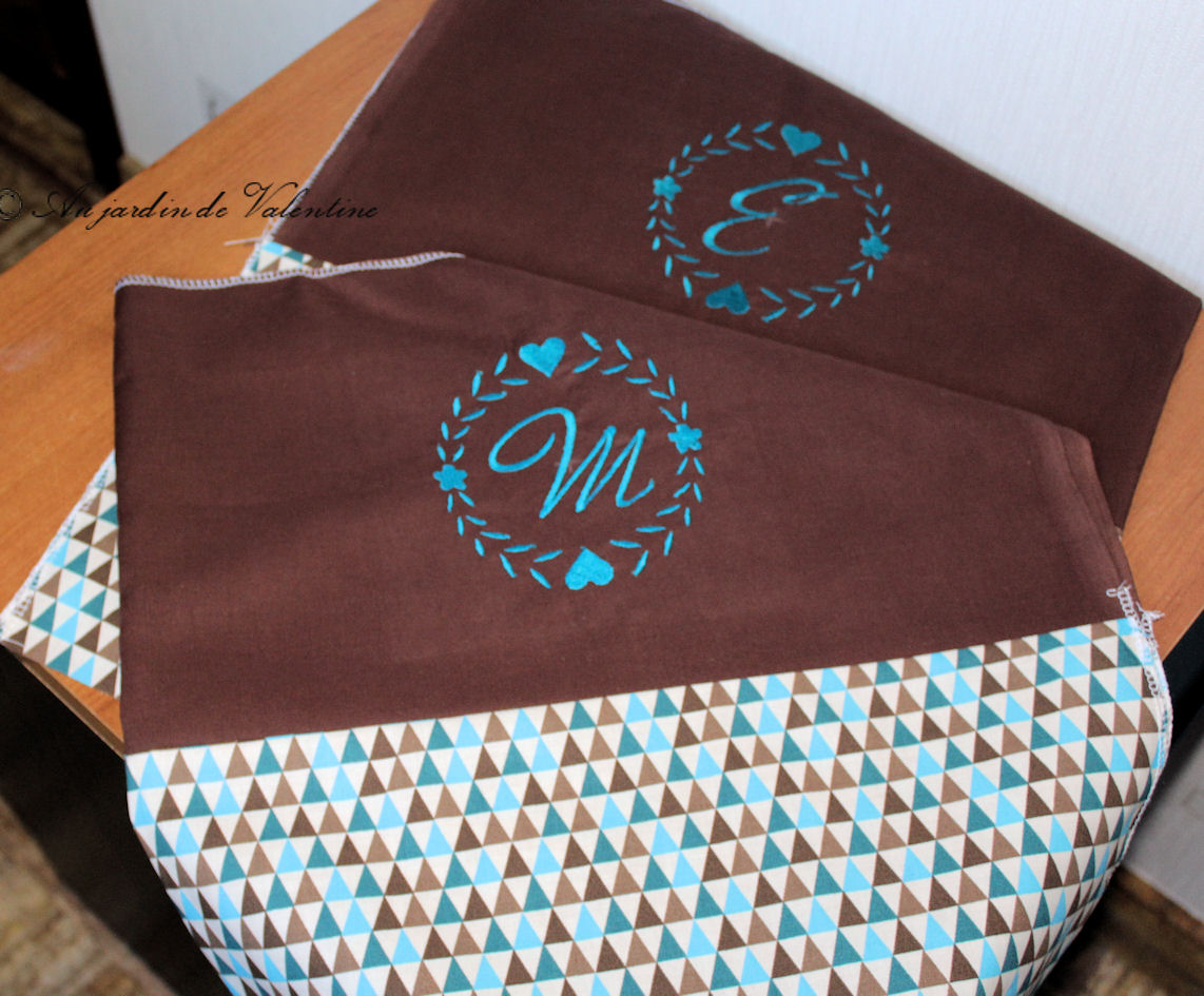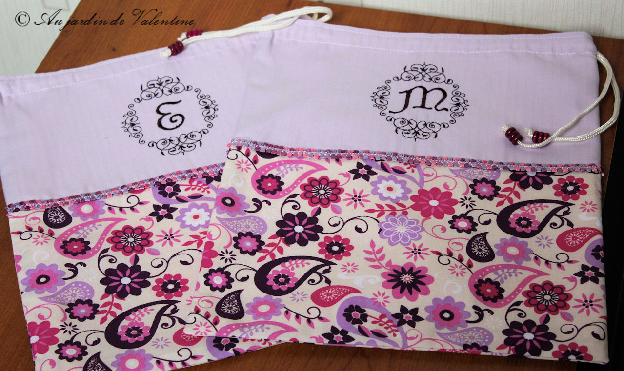 * Assemblez 2 par 2 , le tissu uni à l'imprimé, pour chaque côté, de chaque pochon * Faire la broderie sur un côté du pochon