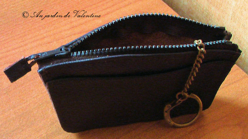 * Lorsque votre porte-monnaie est entièrement cousu, passer le papier-verre sur la tranche du cuir , visible sur les 2 bords latéraux et le bord inférieur ( 2 fois) afin d'affiner les aspérités * Mélanger 3/4 gouttes de colle à autant d'eau, et avec le pinceau passer sur la surface de la tranche poncée * Avec un chiffon sec et non pelucheux, frotter énergiquement la tranche , jusqu'à séchage complet de ce mélange de colle/eau. Vous constaterez au fur et à mesure de votre avancée, que cette tranche rugueuse et pas très esthétique, devient brillante . * Il ne vous reste qu'à mettre un petit carré de cuir au curseur de la fermeture à glissière et à placer la chaînette pour la clé.