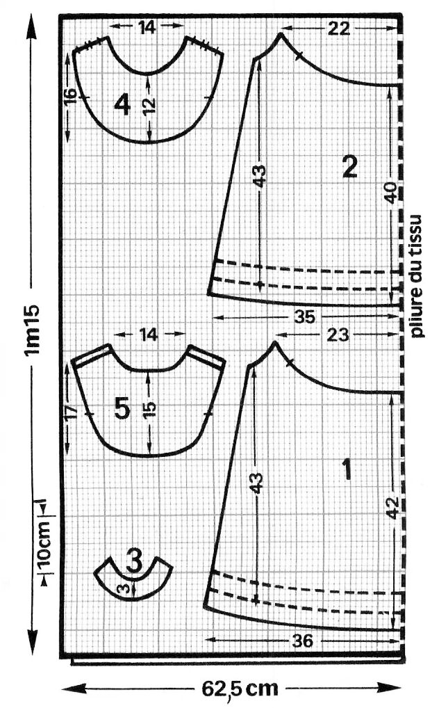 Fournitures: 1.15 m de cotonnade en 125; 4 m de croquet; 6 boutons boule; du fil Patron : Coupe: Pliez le tissu endroit contre endroit puis tracer les pièces sachant qu'un centimètre du schéma = 10 cm Couper le tissu sans oublier 2 cm de plus pour les coutures et un ourlet de 5 cm dans le bas