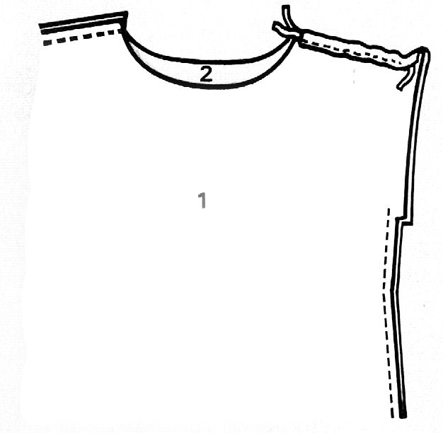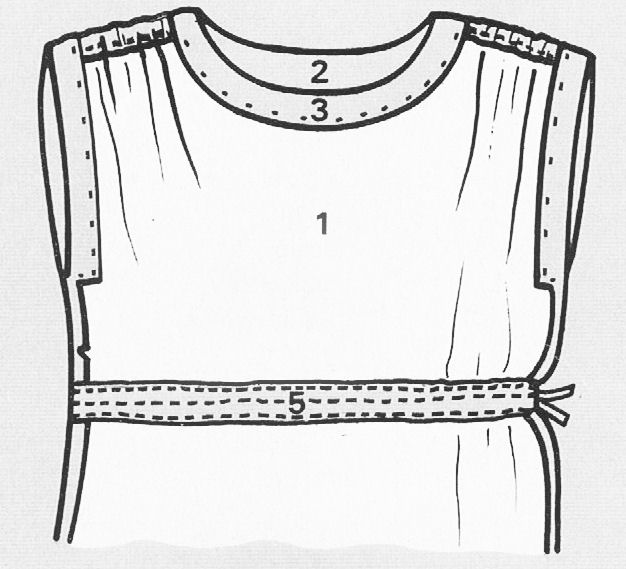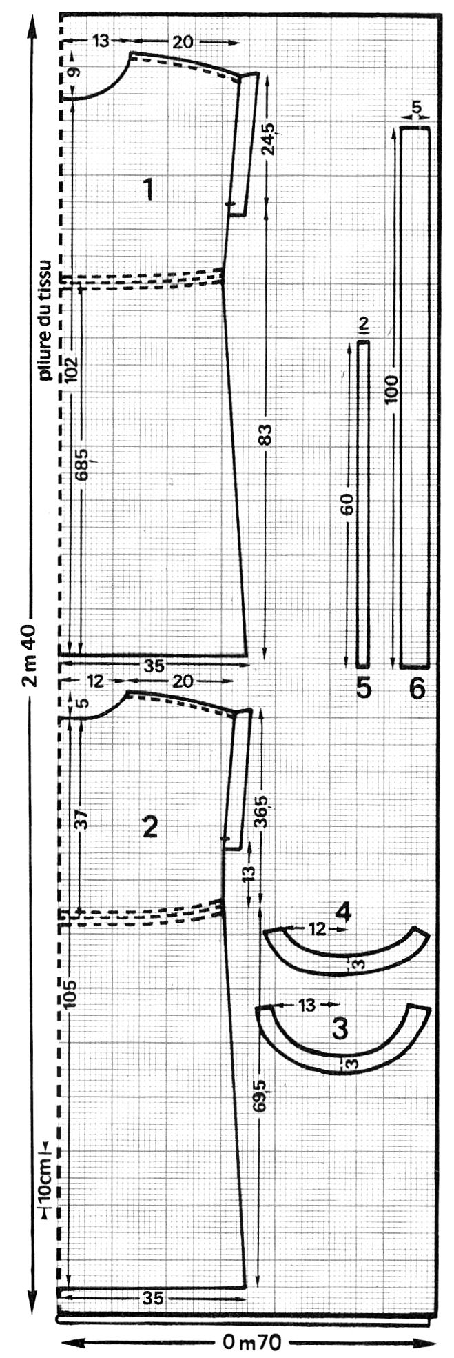 Coupe : * Plier le tissu en son milieu, endroit contre endroit * Posez le à plat sur une table puis tracez les pièces placées sur le schéma sachant qu'1cm du schéma = 10 cm de votre tissu * Couper le tissu en double épaisseur, à l'exception des parementures n°3 et 4, ceci sans oublier 2 cm de plus pour les coutures et un ourlet de 5 cm dans le bas * Assembler le devant n°1 au dos n°2 par les coutures de côtés et d'épaules. Ouvrez celles-ci au fer puis faites une surpiqûre à 7 mm de part et d'autre des coutures d'épaules .