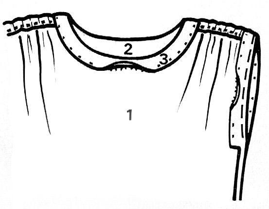 * Glissez un élastique à l'intérieur de ces passages, resserrez-le sur 11 cm et calez-le aux extrêmités. * Réunissez la parementure du décolleté devant n°3 à celle du dos n°4 par les épaules puis bâtissez ces pièces endroit contre endroit de la robe ; piquez le long du décolleté puis retournez et rabattez à plat contre l'envers. Bâtissez également les rentrés des entournures contre l'envers et rabattez les.