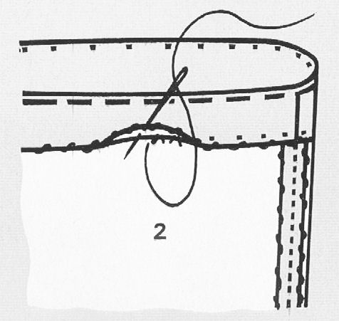 * Glissez les élastiques dans les passages ainsi délimités, réglez leur longueur selon votre tour de taille et fermez-les * Bâtissez l'ourlet de la base contre l'envers puis baguez le à points glissés faits de droite à gauche, en bas dans l'épaisseur du tissu, en haut dans le bord surfilé de l'ourlet que l'on soulève.