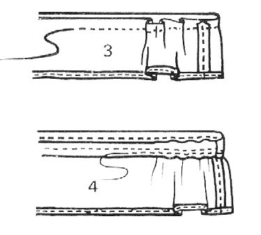 * Assembler et fermer les volants n°3 et n°4 puis piquez un petit ourlet rentré à la base de ceux-ci. Plier contre l'envers le rentré pris à même le volant n°4 puis froncez le haut des volants aux dimensions du bas de la jupe.