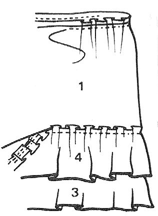 * Monter le volant n°3 le long de la base de la jupe puis piquez le volant n°4 à l'emplacement tracé sur le schéma. Froncer le haut de la jupe à la dimension correspondante de l'empiècement