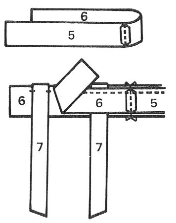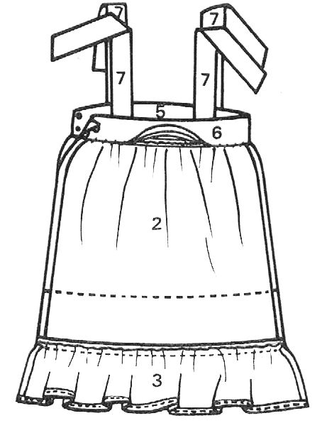 * Réunir le devant n°5 au dos n°6 de l'empiècement par la couture du côté droit, ceci pour le desssous et le dessus. Préparer les bretelles n°7 et batissez-les sur le dessus de l'empiècement devant et dos, à 6 cm des milieux.