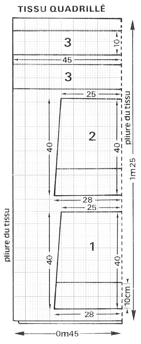 Coupe Pliez-les endroit contre endroit et posez-les sur une table ( leur envers contre celle-ci) puis tracez toutes les pièces placées sur les schémas côtés Coupez les tissus sans oublier 1cm de + pour les coutures et un ourlet de 2 cm pour la base des volants Couture * Réunir le devant n°1 de la jupe au dos n°2 par les coutures de côtés en réservant une ouverture au côté gauche