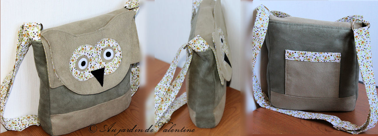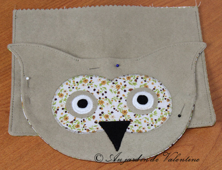 - Préparer la tête de la chouette en fixant les différents morceaux des yeux , puis le bec, sur les emplacements correspondants - Doubler la tête en laissant une ouverture pour retourner l'ouvrage sur l'endroit - Fermer cette ouverture par un point glissé - Coudre le rabat sur 3 côtés et retourner sur l'endroit . Le surpiquer sur ces 3 côtés à 2mm du bord - Surpiquer près du bord, les 2 oreilles de la chouette ( qui resteront libres) - Puis maintenir la tête sur le rabat et surpiquer la partie entre les 2 oreilles, ainsi que le contour arrondi de la tête