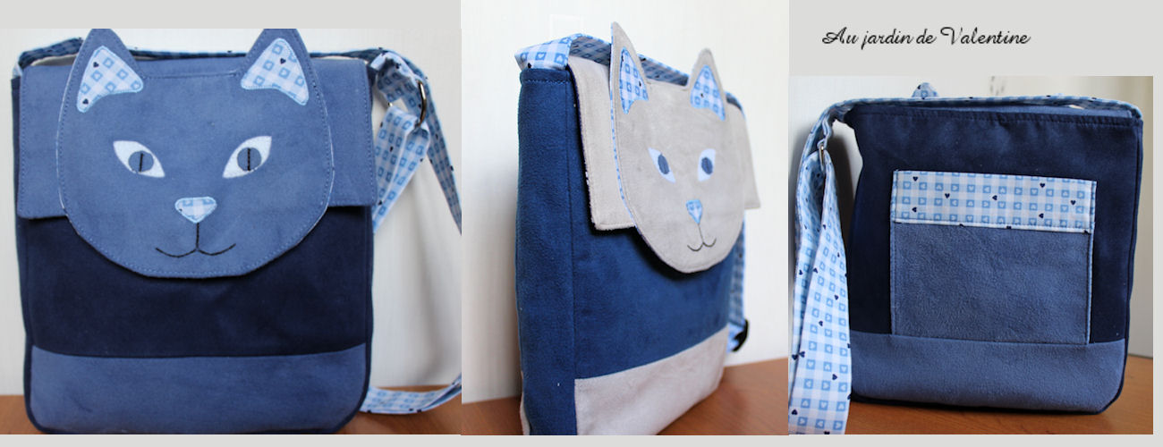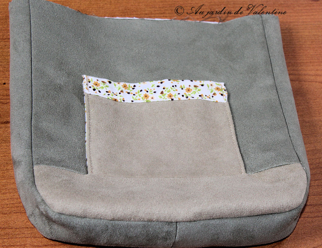 - Coudre les 3 côtés de la petite poche et fixer le rabat imprimé - Insérer le 4e côté entre les morceaux bicolores qui forment le devant/dos du sac