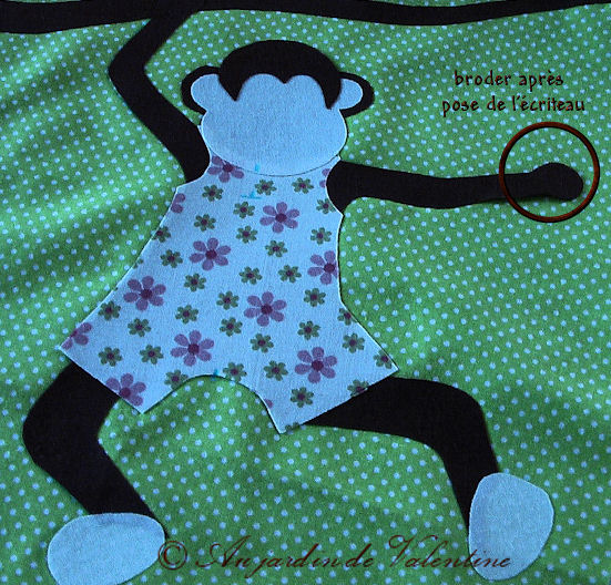 COUTURE - Poser le motif sur le fond imprimé et exécuter la broderie du singe - Préparer la poche pour l'écriteau - Faire la broderie de l'écriteau et monter la poche (option) - Poser l'ensemble sur un côté du sac en skaï ( recto) et fixer le contour par un point de surfilage serré ( ou de bourdon) après avoir placé l'écriteau